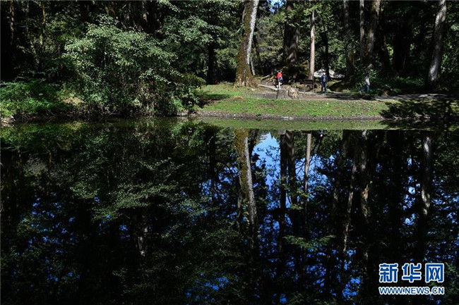10月7日,游客在阿里山的樹林中游覽。