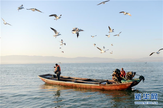 新疆博湖縣的漁民在博斯騰湖捕魚(10月12日攝)。入秋以來,新疆博斯騰湖碧波蕩漾,美景如畫,吸引各地游客前來游玩。新華社記者丁磊攝
