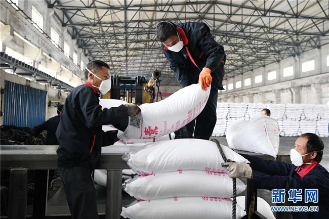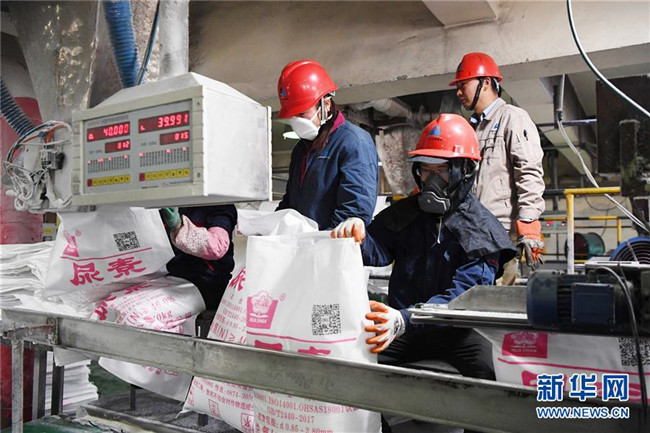 10月14日,轉(zhuǎn)移就業(yè)的農(nóng)民在云南省曲靖市沾益區(qū)花山街道勞務(wù)中心尿素包裝裝卸車間工作。