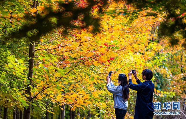 金秋時(shí)節(jié),河北邯鄲市峰峰礦區(qū)義井鎮(zhèn)太行藥王谷景區(qū)內(nèi)的紅楓由綠轉(zhuǎn)紅,“楓”情醉人。 新華社記者 王曉 攝