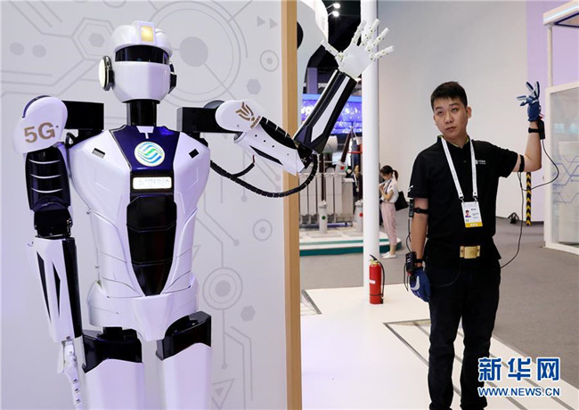 一名工作人員(右)在上海舉行的2019世界人工智能大會(huì)上演示一款基于5G網(wǎng)絡(luò)實(shí)現(xiàn)遠(yuǎn)程控制的機(jī)器人(8月29日攝)。新華社記者 方喆攝
