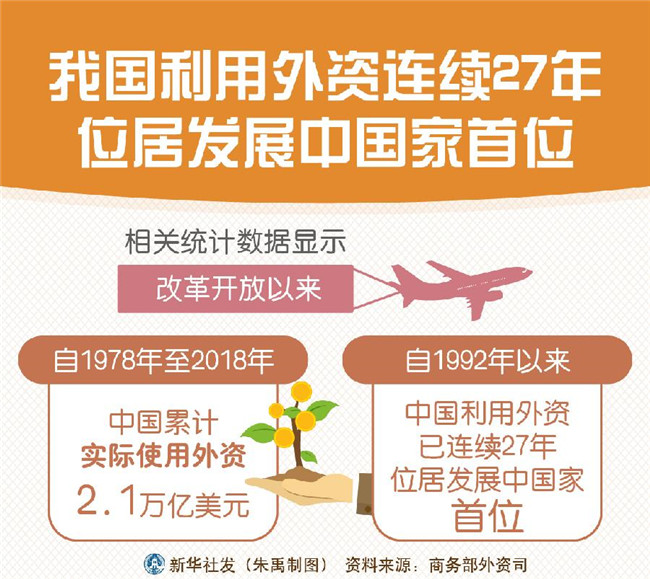 葉威透露,相關(guān)統(tǒng)計數(shù)據(jù)顯示,改革開放以來,自1978年至2018年,中國累計實際使用外資2.1萬億美元;自1992年以來,中國利用外資已連續(xù)27年位居發(fā)展中國家首位。