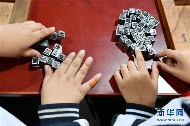 山東省無棣縣無棣希賢學校的小學生在魯北非遺體驗中心體驗活字印刷工藝(10月30日攝)。