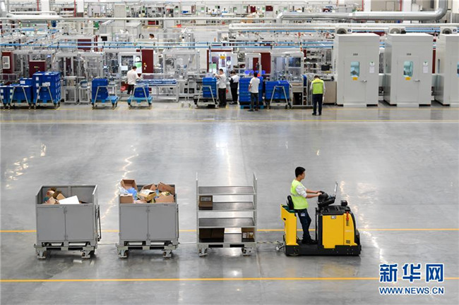 江蘇太倉博澤汽車部件有限公司工作人員在生產(chǎn)車間運(yùn)輸產(chǎn)品(10月30日攝)。新華社記者 李博 攝