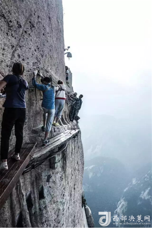 長空棧道位于華山南峰東側(cè)山腰,是華山派第一代宗師元代高道賀志真為遠(yuǎn)離塵世靜修成仙,在萬仞絕壁上鑲嵌石釘搭木椽而筑。長空棧道的盡頭便是思過崖。