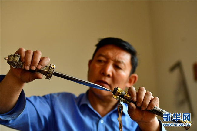 11月17日,芒擦藏刀匠人更求彭措在試藏刀刀身與刀鞘的契合度。新華社記者 張龍 攝