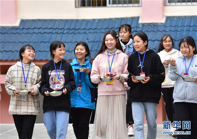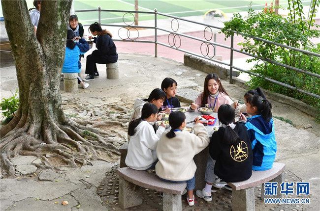 12月5日,在廣西融水苗族自治縣?;钢袑W,林洋港(正面,右一)和學生們在校園里吃午飯。林洋港是西北工業(yè)大學的在讀碩士研究生,今年9月來到融水苗族自治縣?;钢袑W任物理老師。 新華社記者 黃孝邦 攝