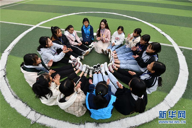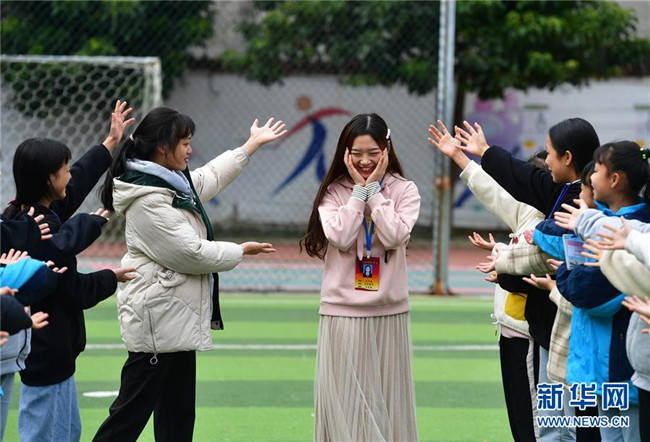 12月5日,在廣西融水苗族自治縣?;钢袑W,林洋港(正面中,粉色衣服)和學生們在球場上唱歌。林洋港是西北工業(yè)大學的在讀碩士研究生,今年9月來到融水苗族自治縣保桓中學任物理老師。 新華社記者 黃孝邦 攝
