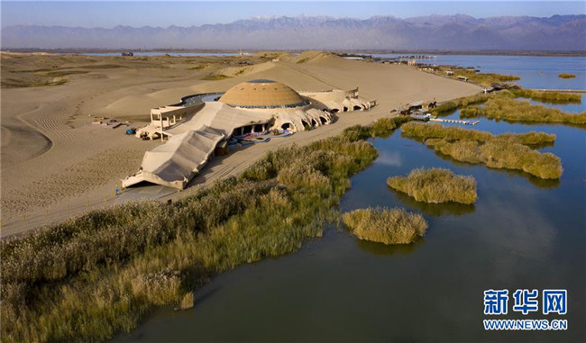 位于寧夏石嘴山市平羅縣境內(nèi)的沙湖景區(qū),依沙傍水呈現(xiàn)出獨特的魅力(10月30日無人機拍攝)。 新華社記者 馮開華 攝