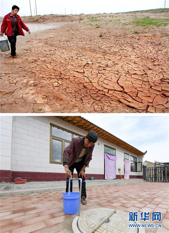 拼版照片:上圖為寧夏同心縣預旺鎮(zhèn)村民趙海江在北旺水庫取水(新華社記者李紫恒2006年8月13日攝);