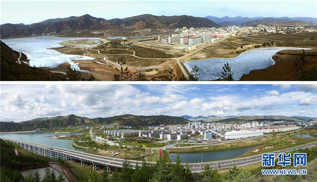 拼版照片:上圖為2009年1月30日拍攝的寧夏固原市隆德縣境內(nèi)的渝河景象;下圖為經(jīng)過流域綜合治理后的渝河(2018年5月19日攝)。 新華社發(fā)(李玉 攝)