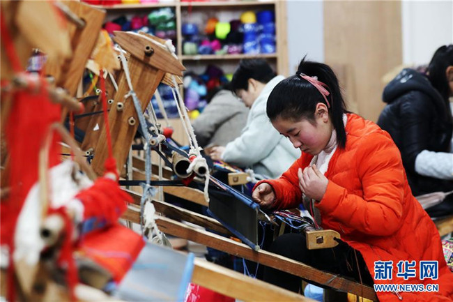 1月14日,在重慶市黔江區(qū)小南海鎮(zhèn)土家十三寨“西蘭卡普扶貧工坊”,員工在編織西蘭卡普。新華社發(fā)(楊敏 攝)