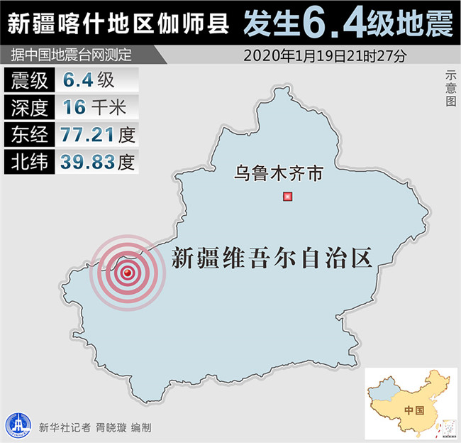 據(jù)中國地震臺(tái)網(wǎng)正式測定,19日21時(shí)27分在新疆喀什地區(qū)伽師縣發(fā)生6.4級地震,震源深度16千米,震中位于北緯39.83度,東經(jīng)77.21度。