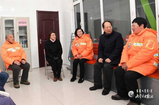 每逢節(jié)慶假日,往往是環(huán)衛(wèi)工人最忙最累的時(shí)候。石泰峰、布小林惦記著這些非常辛苦的勞動(dòng)者,來(lái)到賽罕區(qū)環(huán)衛(wèi)局管理八所,向他們祝賀新年。在環(huán)衛(wèi)工人休息室,石泰峰、布小林與大家圍坐在一起親切交談,了解春節(jié)期間值班安排情況,仔細(xì)察看休息室及相關(guān)保障情況。石泰峰深情地說(shuō),環(huán)衛(wèi)工人是城市的“美容師”,你們一人勞累,換來(lái)萬(wàn)人清潔,沒(méi)有你們的辛勤工作,就沒(méi)有城市環(huán)境的清潔美麗,也就沒(méi)有市民生活的安逸舒適,謝謝你們,給你們拜年了。