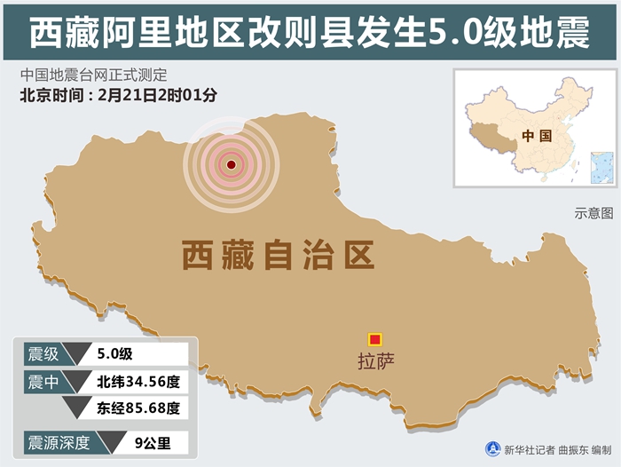 中國(guó)地震臺(tái)網(wǎng)正式測(cè)定:2月21日2時(shí)01分,在西藏阿里地區(qū)改則縣(北緯34.56度,東經(jīng)85.68度)發(fā)生5.0級(jí)地震,震源深度9公里。