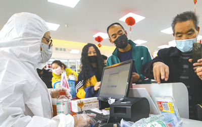 疫情期間,人們對自己的健康狀況更加關(guān)注。圖為在山東省臨沂市沂蒙路一家醫(yī)藥零售連鎖店內(nèi),消費者正在購買防護口罩和酒精消毒液。人民視覺