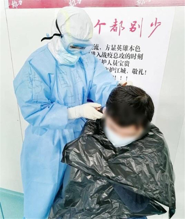 1艙有康復(fù)人員想理發(fā),手頭沒有工具,朱晴護(hù)士長得知后,聯(lián)系下個班次護(hù)士帶來推子,給大家理發(fā)。“看你動作很嫻熟啊,以前練過的吧”,“圍觀群眾”打趣道。“現(xiàn)學(xué)現(xiàn)賣,大家要求不要太高,有壓力?。?rdquo;朱晴說。一直推到推子沒電,朱晴給6位康復(fù)人員簡單修剪了頭發(fā)。得知朱晴是西安醫(yī)療隊的護(hù)士,大家都親切的稱她“肉夾饃”!