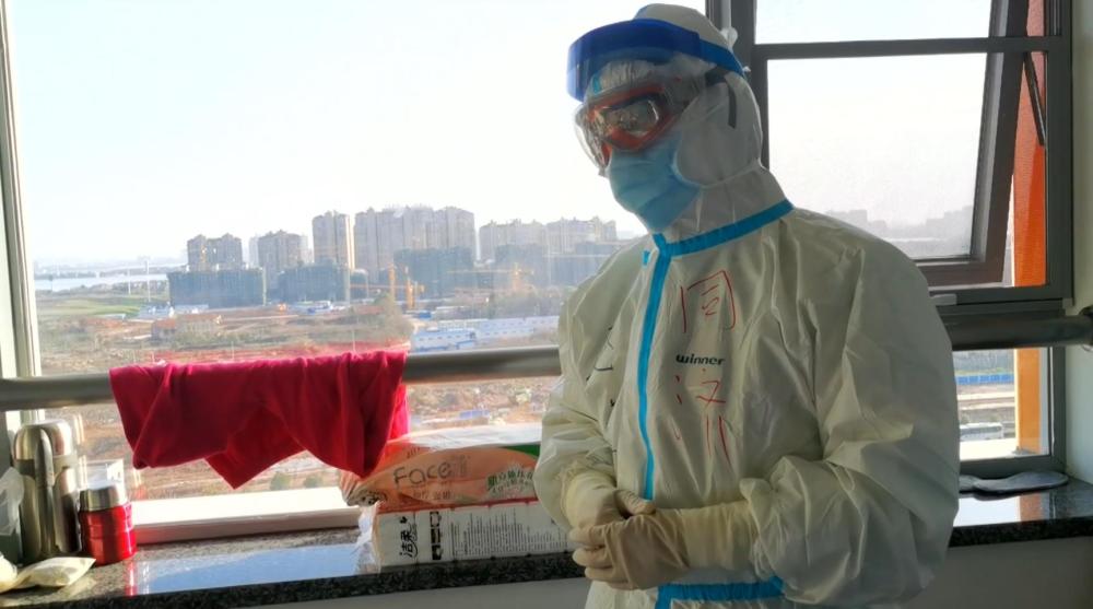 圖為遼寧援助武漢雷神山醫(yī)療隊隊員張倩在隔離病房外等待隊友。