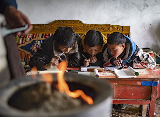 扎西卓瑪在寄宿制學(xué)校上學(xué),在校時(shí)總是很早就起床背誦課文,可在家就需要靠自覺(jué)了。