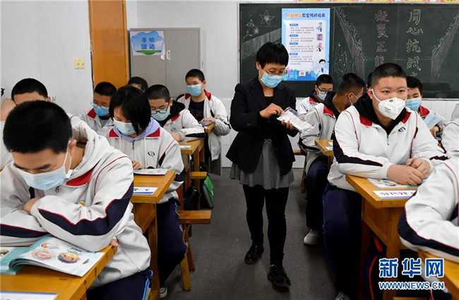 4月7日,西安匯知中學初三畢業(yè)班的老師向?qū)W生發(fā)放口罩。