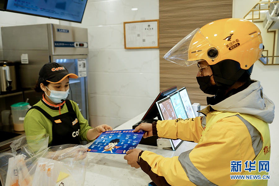 王淞在取餐前,先將一份宣傳海報交給了配餐的商家。這是他今天的第9個訂單,王淞覺得參加這樣的活動十分有意義,讓自己在送餐掙錢之外又多了一份社會責任感。新華網(wǎng) 韓夢霖 攝