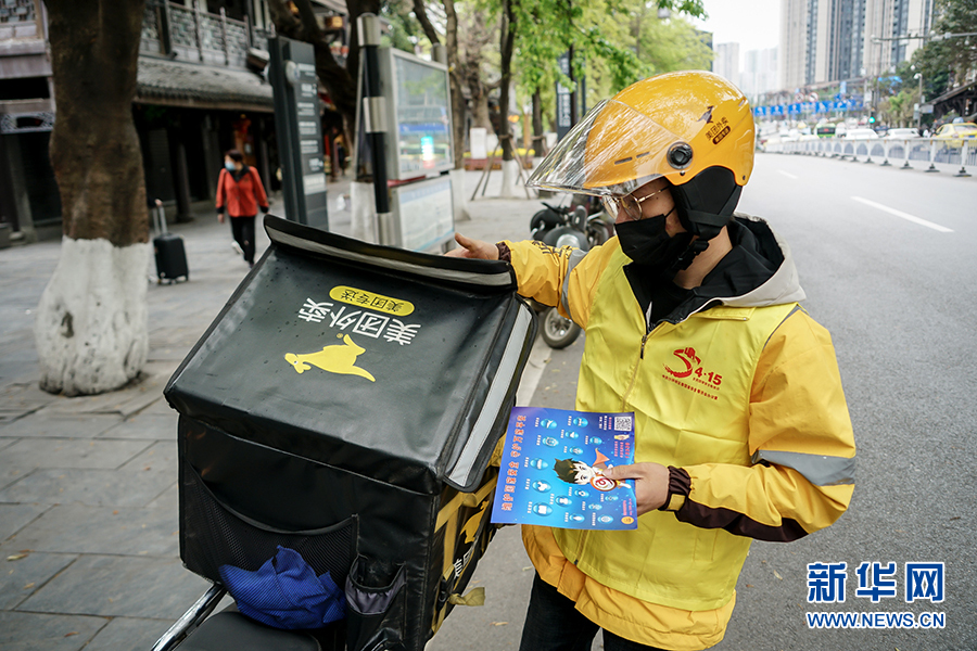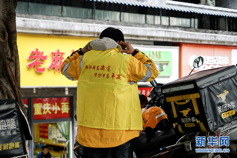 4月13日,王淞騎著摩托趕往取餐點取餐。他是美團重慶分公司沙坪壩區(qū)烈士墓配送點的一名普通“外賣小哥”,平時他騎著摩托車風里來雨里去,在山城的大街小巷里接單送餐。今天王淞多了一個讓他感到自豪的特殊身份,那就是一名國家安全宣傳的“使者”。新華網(wǎng) 韓夢霖 攝