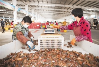 走進(jìn)湖北潛江小龍蝦交易中心,眼前一派忙碌景象。500多家水產(chǎn)商戶已經(jīng)復(fù)工,工人們忙著分揀包裝,成箱的小龍蝦被裝上物流車輛,運往全國各地。
