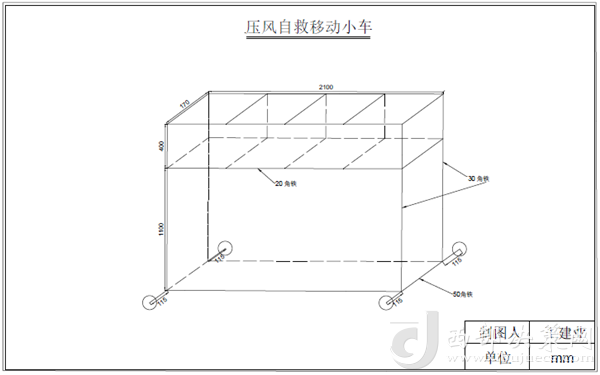 圖紙畫好后,王建業(yè)火速發(fā)給了材料員老王,老王憑借多年的人脈,在車間找來電焊師傅,又拾了廢棄的幾塊角鋼和幾個車輪,半晌就把王建業(yè)想要的東西給做了出來。其實很簡單,根據(jù)壓風自救箱的尺寸,利用扁鐵構建整體框架,下方安裝四個滑輪即可投入使用。
