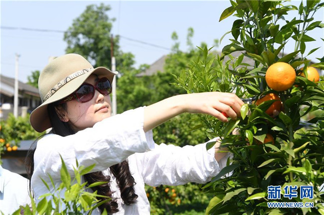 4月29日,在重慶忠縣“三峽橘鄉(xiāng)”田園綜合體內(nèi),游客在果園內(nèi)采摘。新華社記者 唐奕 攝