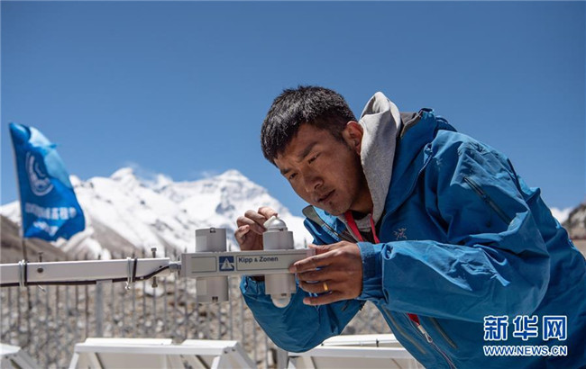 西藏自治區(qū)氣象局工作人員在珠峰大本營自動氣象站觀測風速風向等氣象數(shù)據(jù)(5月10日攝)。新華社記者 晉美多吉 攝