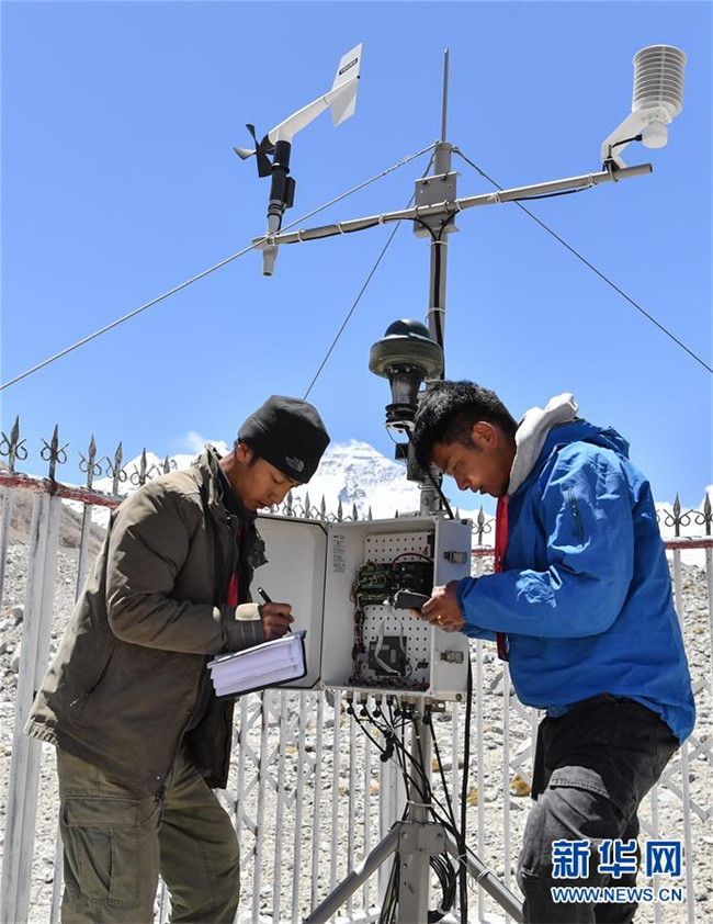 西藏自治區(qū)氣象局工作人員在珠峰大本營自動氣象站記錄氣象數(shù)據(jù)(5月10日攝)。新華社記者 普布扎西 攝