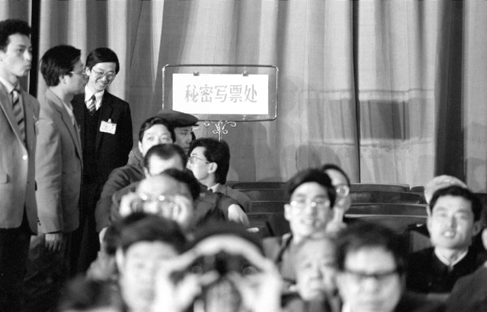 1988年4月,七屆全國(guó)人大一次會(huì)議第六次全體會(huì)議,投票選舉國(guó)家機(jī)構(gòu)領(lǐng)導(dǎo)人。圖為首次設(shè)立的秘密寫(xiě)票處。