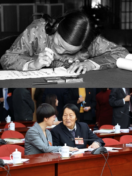 申紀(jì)蘭用她半生時(shí)間見(jiàn)證了中國(guó)民主法制建設(shè)的進(jìn)程。上圖為出席第一屆全國(guó)人民代表大會(huì)第一次會(huì)議的人大代表申紀(jì)蘭在報(bào)到(1954年9月攝);下圖為她(右)在十三屆全國(guó)人大二次會(huì)議山西代表團(tuán)會(huì)議間隙與青年代表交流(2019年3月攝)。