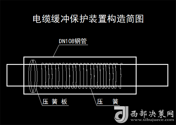 為了解決這一難題,該工區(qū)組織人員經(jīng)過(guò)多次試驗(yàn)研討后,決定將DN108鋼管作為緩沖裝置的外管,將加工好的壓板與中間軸焊接在一端做成壓簧盤(pán),再將加工好的2寸法蘭盤(pán)焊接在DN108管一端,將壓簧放入DN108鋼管內(nèi),穿入中間軸。用加工好的2寸法蘭盤(pán)封閉DN108鋼管另一端,在中間軸的一端安裝加工好的電纜導(dǎo)向輪,并安裝在固定架上。雙電纜卡子固定電纜可根據(jù)使用長(zhǎng)度調(diào)整導(dǎo)向輪,隨著梭車(chē)的行走方向而改變電纜方向,避免電纜彎曲打折;利用彈簧彈性,發(fā)揮緩沖作用,將拉力轉(zhuǎn)化為彈性勢(shì)能,減少對(duì)電纜的損害。