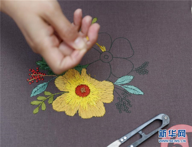 5月23日,在重慶市開(kāi)州區(qū)古今庭漢繡培訓(xùn)中心,漢繡繡娘在繡制文創(chuàng)產(chǎn)品。新華社發(fā)(黃偉 攝)