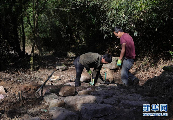 5月25日,工人在修復(fù)大相嶺茶馬古道。新華社記者江宏景攝