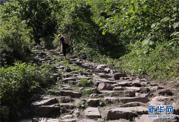 5月25日,工人背著物料走在茶馬古道上。新華社記者江宏景攝
