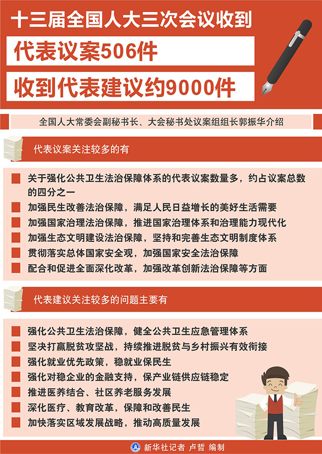 全國人大常委會(huì)副秘書長、大會(huì)秘書處議案組組長郭振華介紹,今年一個(gè)突出特點(diǎn)是關(guān)于強(qiáng)化公共衛(wèi)生法治保障體系的代表議案數(shù)量多,約占議案總數(shù)的四分之一。圍繞加快構(gòu)建疫情防控法律體系,提出修改傳染病防治法、刑法、治安管理處罰法,加大對(duì)瞞報(bào)傳染病、妨礙防疫工作及非法獵殺、銷售、食用野生動(dòng)物等行為的處罰力度,修改中醫(yī)藥法、執(zhí)業(yè)醫(yī)師法、獻(xiàn)血法,以及制定公共衛(wèi)生安全保障等方面的法律。圍繞健全國家公共衛(wèi)生應(yīng)急管理體系,提出修改突發(fā)事件應(yīng)對(duì)法、價(jià)格法、慈善法,制定社會(huì)救助法以及戰(zhàn)略物資儲(chǔ)備、行政征用、信息公開、社區(qū)應(yīng)急管理、現(xiàn)場救護(hù)等方面的法律。圍繞構(gòu)建國家生物安全法律法規(guī)體系,提出修改野生動(dòng)物保護(hù)法、動(dòng)物防疫法、食品安全法、漁業(yè)法,制定生物安全法等法律。