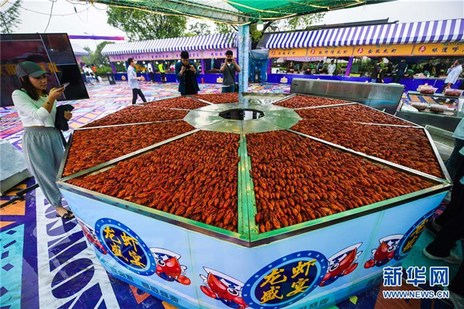 5月30日,游客在龍蝦狂歡節(jié)現(xiàn)場拍攝小龍蝦。新華社記者 徐昱 攝