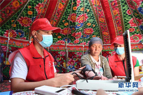6月20日,新疆阿勒泰地區(qū)布爾津縣也格孜托別鄉(xiāng)克孜勒托蓋村村醫(yī)來到布爾津縣黑流灘草原給牧民巴合提古麗·塔拉甫汗檢查身體。圍繞實現(xiàn)人人享有基本醫(yī)療衛(wèi)生服務(wù)目標(biāo),2016年起,新疆布爾津縣開展家庭醫(yī)生簽約服務(wù)工作。該縣組建家庭醫(yī)生簽約團(tuán)隊65個,團(tuán)隊醫(yī)務(wù)人員233名,通過手機APP、基本公衛(wèi)系統(tǒng)與全縣建檔立卡貧困戶進(jìn)行電子化簽約,提升村醫(yī)隨訪的工作效率和質(zhì)量。截至目前,已完成簽約42936人,履約40043人。新華社記者沙達(dá)提攝