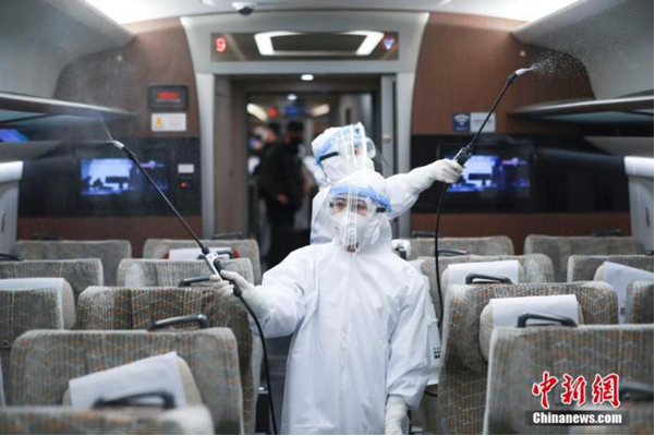 資料圖:工作人員在一輛高鐵車廂內執(zhí)行消毒任務。中新社記者 賈天勇 攝