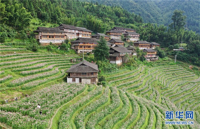 近日,廣西龍勝各族自治縣泗水鄉(xiāng)周家村布尼梯田種植的近千畝鮮花競(jìng)相開放,美不勝收。 新華社記者 陸波岸 攝