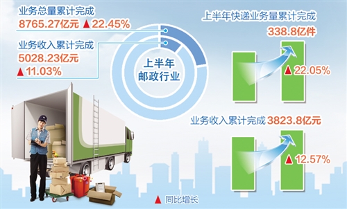 國家郵政局統(tǒng)計數(shù)據(jù)顯示,上半年,郵政快遞業(yè)逐漸擺脫新冠肺炎疫情影響逆勢上揚,主要經(jīng)濟指標超過去年同期水平。1月至6月,郵政行業(yè)業(yè)務(wù)總量累計完成8765.27億元,同比增長22.45%;業(yè)務(wù)收入(不包括郵政儲蓄銀行直接營業(yè)收入)累計完成5028.23億元,增長11.03%。其中,快遞業(yè)務(wù)量完成338.8億件,增長22.05%,超過2016年全年(312.8億件);快遞業(yè)務(wù)收入完成3823.8億元,增長12.57%。