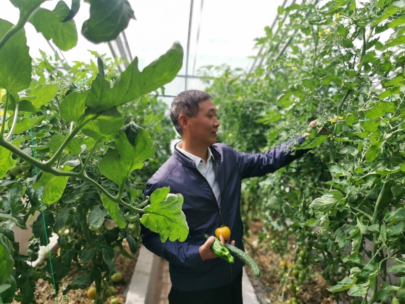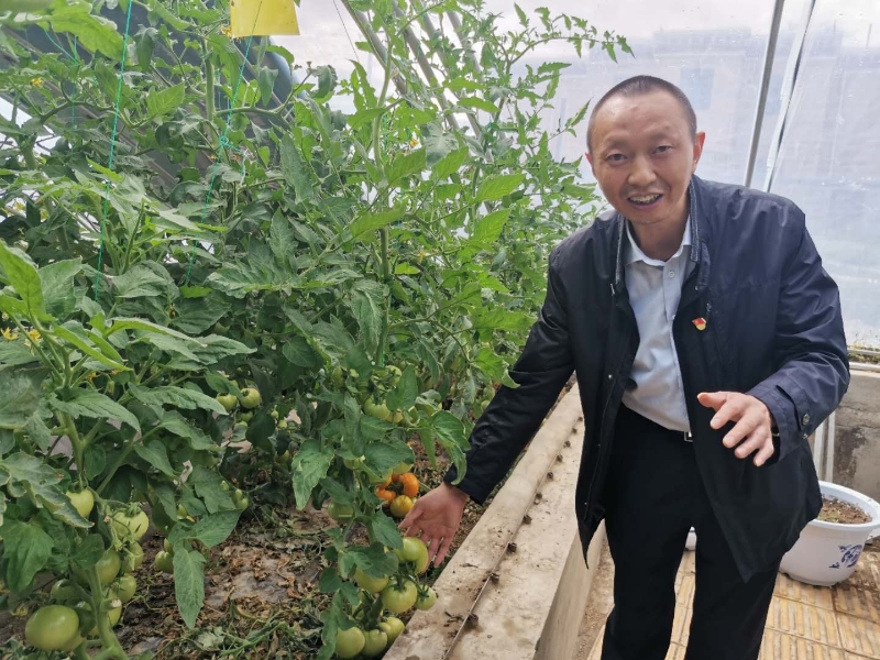 圖為西藏自治區(qū)阿里地委副書記、行署常務(wù)副專員張小平現(xiàn)場(chǎng)了解大棚果蔬種植情況。