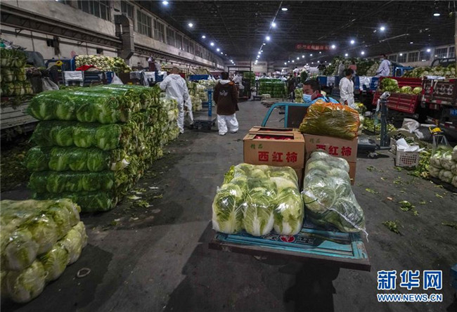 在新疆九鼎農(nóng)產(chǎn)品批發(fā)交易市場(chǎng)里,陳金奇(左)采購?fù)尥薏耍?月8日攝)。新華社記者 趙戈 攝