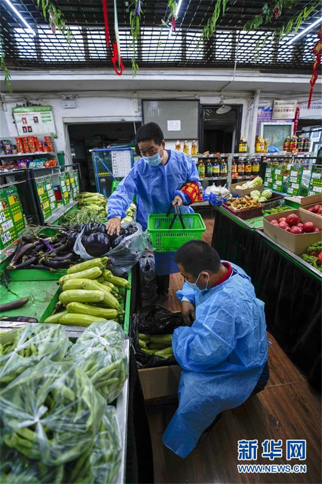 在烏魯木齊市沙依巴克區(qū)揚(yáng)子江街道青松苑社區(qū)蔬菜直銷點(diǎn),陳金奇(前)幫助為小區(qū)居民采買的志愿者按照網(wǎng)絡(luò)訂單挑選蔬菜(8月8日攝)。新華社記者 趙戈 攝