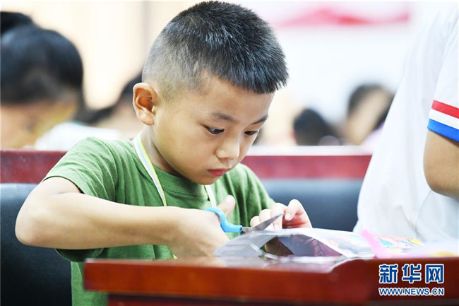 8月13日,貴州省思南縣雙塘街道麗景社區(qū)易地扶貧搬遷安置點(diǎn)的孩子在學(xué)習(xí)剪紙。 新華社記者 楊文斌 攝
