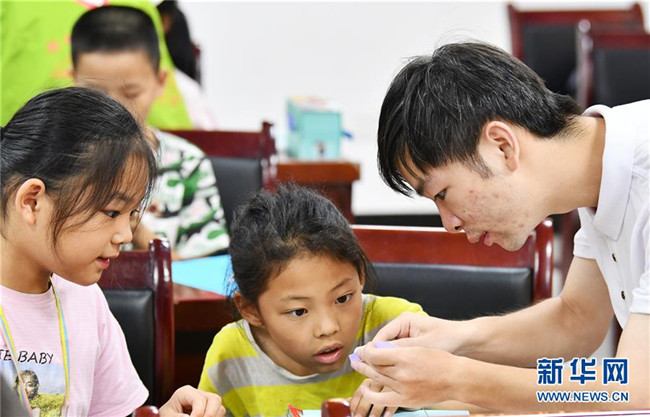 8月13日,在貴州省思南縣雙塘街道麗景社區(qū)易地扶貧搬遷安置點(diǎn),志愿者在指導(dǎo)孩子們學(xué)習(xí)剪紙。新華社記者 楊文斌 攝