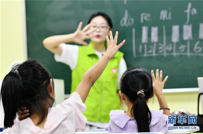 8月13日,在貴州省思南縣雙塘街道麗景社區(qū)易地扶貧搬遷安置點(diǎn),志愿者在給孩子們上音樂(lè)課。 新華社記者 楊文斌 攝