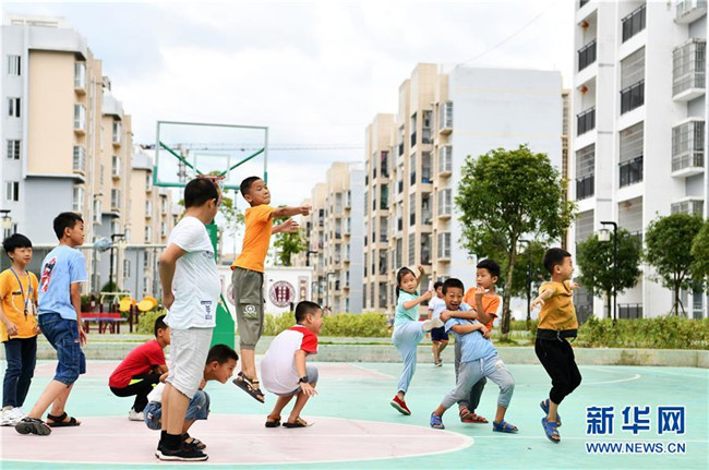 8月13日,在貴州省思南縣雙塘街道麗景社區(qū)易地扶貧搬遷安置點(diǎn),孩子們和志愿者在丟沙包。新華社記者 楊文斌 攝
